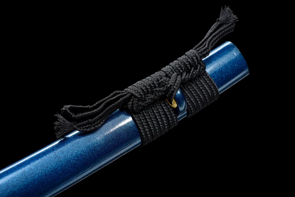 Even though in classical Japanese ao can mean both blue and green, here it is a deep, vivid blue that covers the blade and scabbard of this handmade manganese steel katana. Its almost celestial metallic shade evokes the purity of the sky after a storm, while the black handle reinforces its noble and mysterious look.