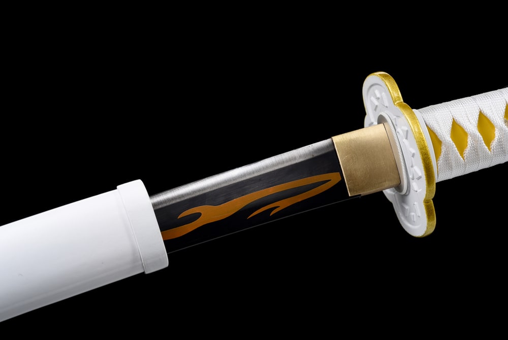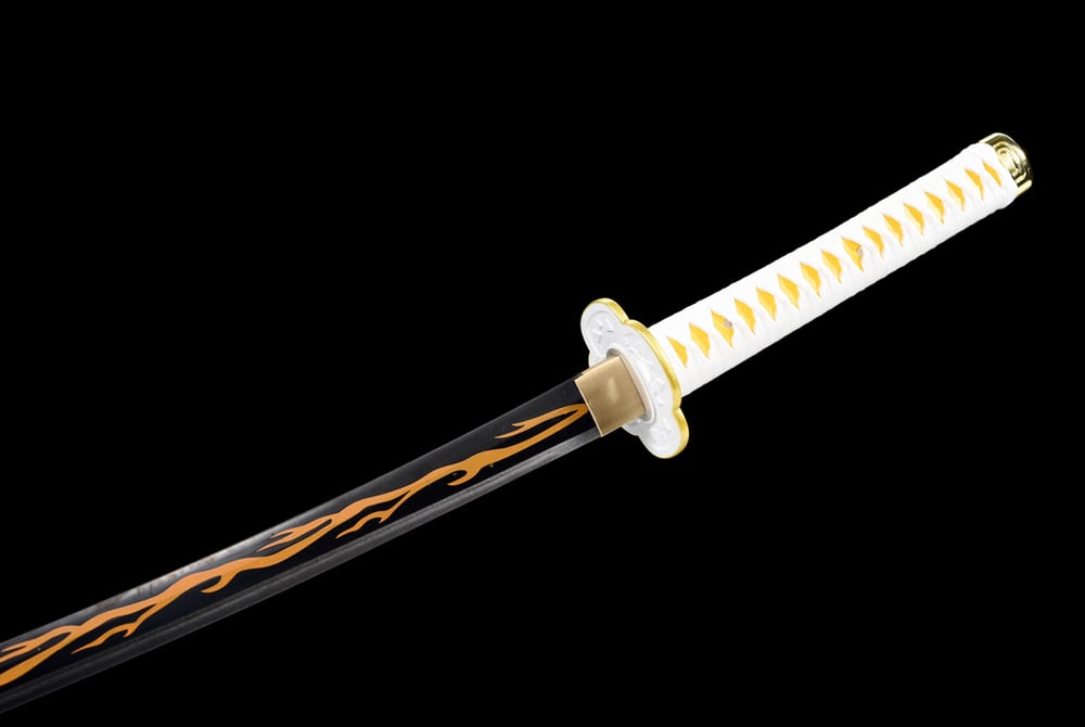 Immerse yourself in the captivating world of Demon Slayer with this exceptional replica that pays tribute to the beloved character Zenitsu. Crafted with artisanal precision, this katana embodies the perfection of Japanese swordsmithing and is infused with the adventurous spirit of Demon Slayer. A yellow lightning pattern decorates the blade of this Japanese sword, which is made from high carbon steel. This high carbon content gives it unmatched durability. The scabbard is made from leather with a wooden core, the handle is solid wood, and the tsuba is crafted from a copper alloy.